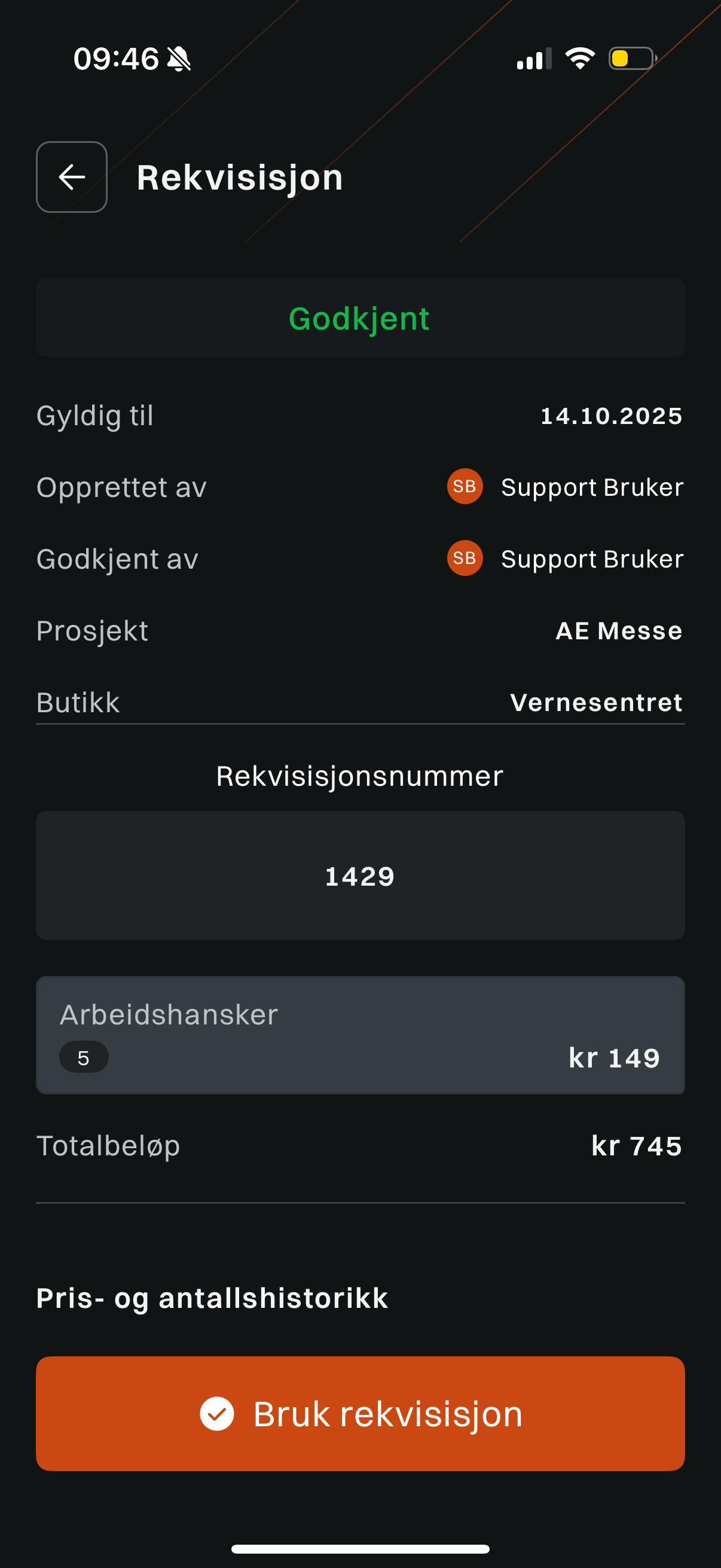 For å løse dette har vi nå slått sammen de to stegene. "Aktiver rekvisisjon" er borte og du trykker nå på knappen “Bruk rekvisisjon” på en godkjent rekvisisjon, når du står i butikken. Du vil da både aktivere rekvisisjonen og merke den som brukt, i ett og samme tastetrykk.