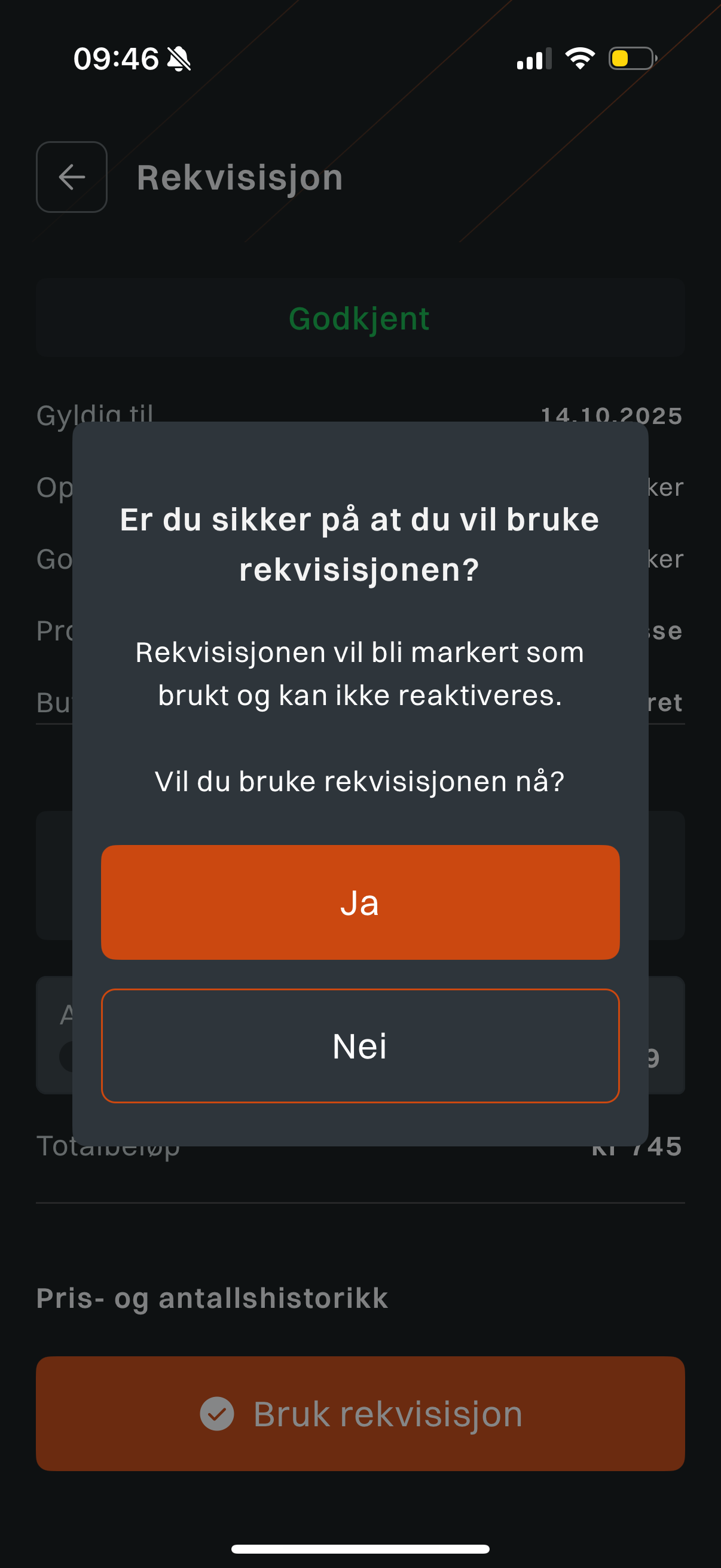 En rekvisisjon kan, som før, kun brukes én gang. En brukt rekvisisjon kan ikke reaktiveres, så det er viktig å vite at du skal bruke rekvisisjonen før du trykker på "ja" i pop-up'en.