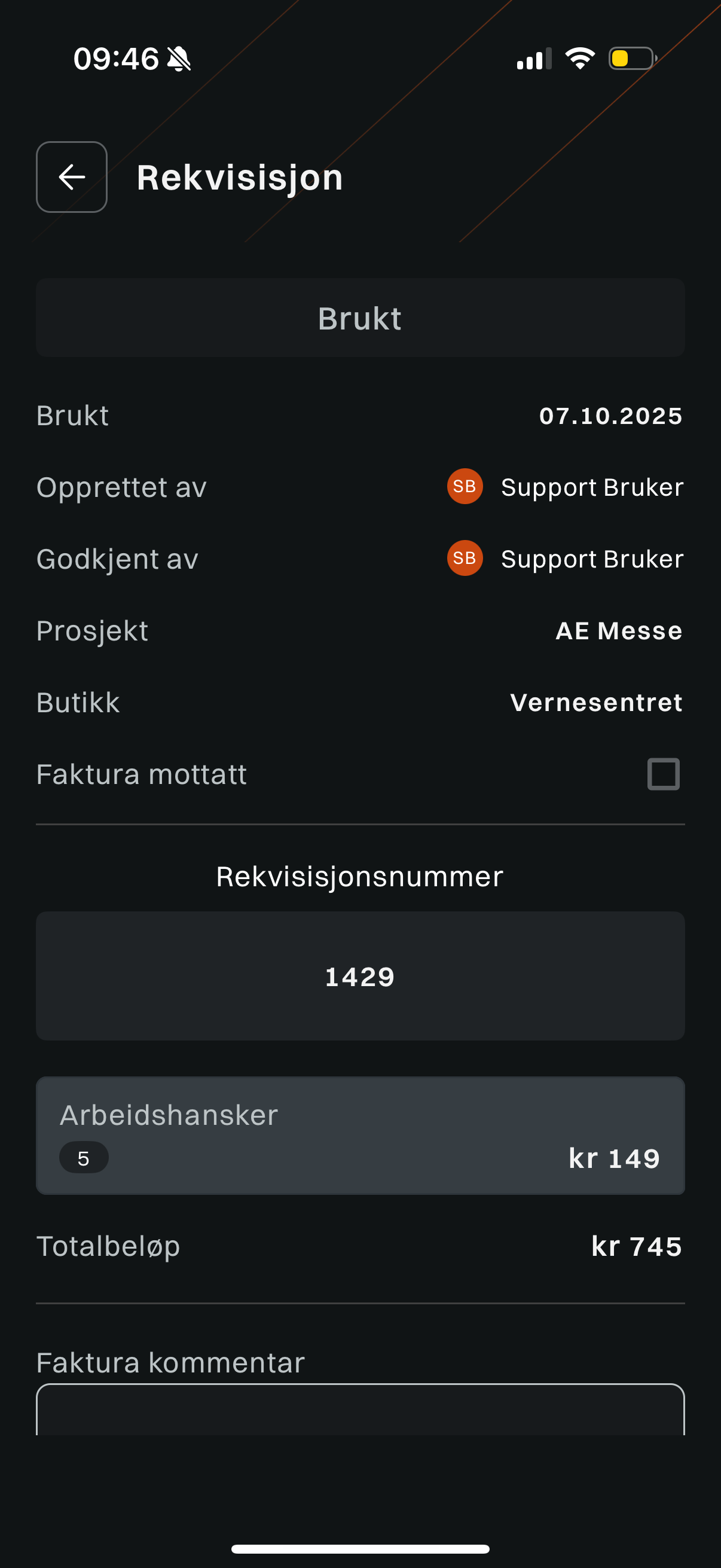 Når rekvisisjonen er registrert som brukt, vil den se slik ut. Og ikke minst, alle rekvisisjoner vil komme med i rapportene fordi de blir markert som brukte.